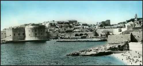 12135 R Dubrovnik. Panorama. Kupalište Ploče. Izrada Zadružna knjiga Beograd 2090 a Kolor "FORUM" Beograd 10.XII.1958. AMN